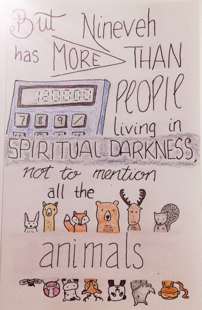 The book of Jonah closes with the verse above. God tells Jonah He is right to care for the 120,000 people living there. We don’t know what happened to Jonah after this, but let’s hope he learned a lesson!