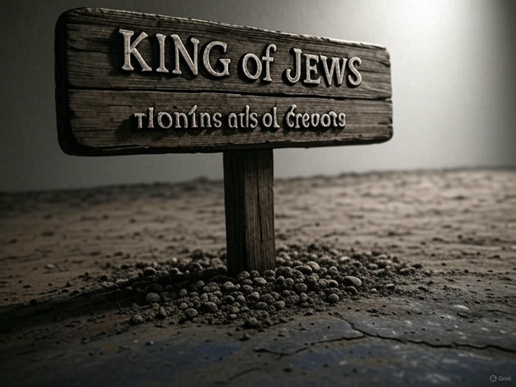 A wooden sign is planted in the ground, surrounded by small pebbles and dirt. The sign has the text “KING of JEWS” prominently displayed in large, bold letters. Below this, there is a line of text in a different script that reads ” πλοκίης αἰς οἱ ςρεοοης” which are random Greek letters for illustration . The background is a plain, slightly textured surface with a gradient of light and shadow.