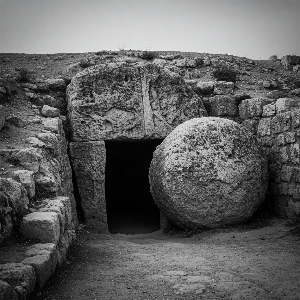 An AI generated image of the garden tomb in black-and-white set against grey sky. The entrance to the tomb is partially open, with a large stone across the right hand side of it.